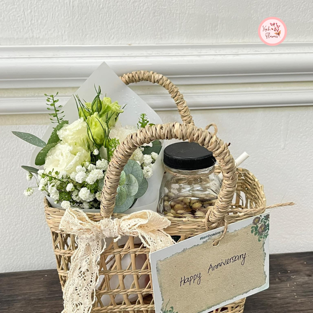 - Thiết kế tinh tế và sáng tạo: Giỏ hoa và đồ uống được bày trí hài hòa, tạo cảm giác tươi mới, đầy sức sống, phù hợp cho mọi lứa tuổi và nhiều dịp khác nhau.